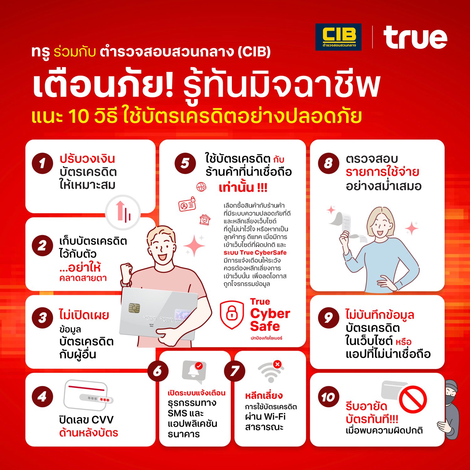 “ทรู ร่วมกับ ตำรวจสอบสวนกลาง (CIB) แนะ 10 วิธี ใช้บัตรเครดิตอย่างปลอดภัย ป้องกันภัยจากมิจฉาชีพ บริการ True CyberSafe สามารถให้การแจ้งเตือน ลดเสี่ยง ลดโอกาสถูกโจรกรรมข้อมูล