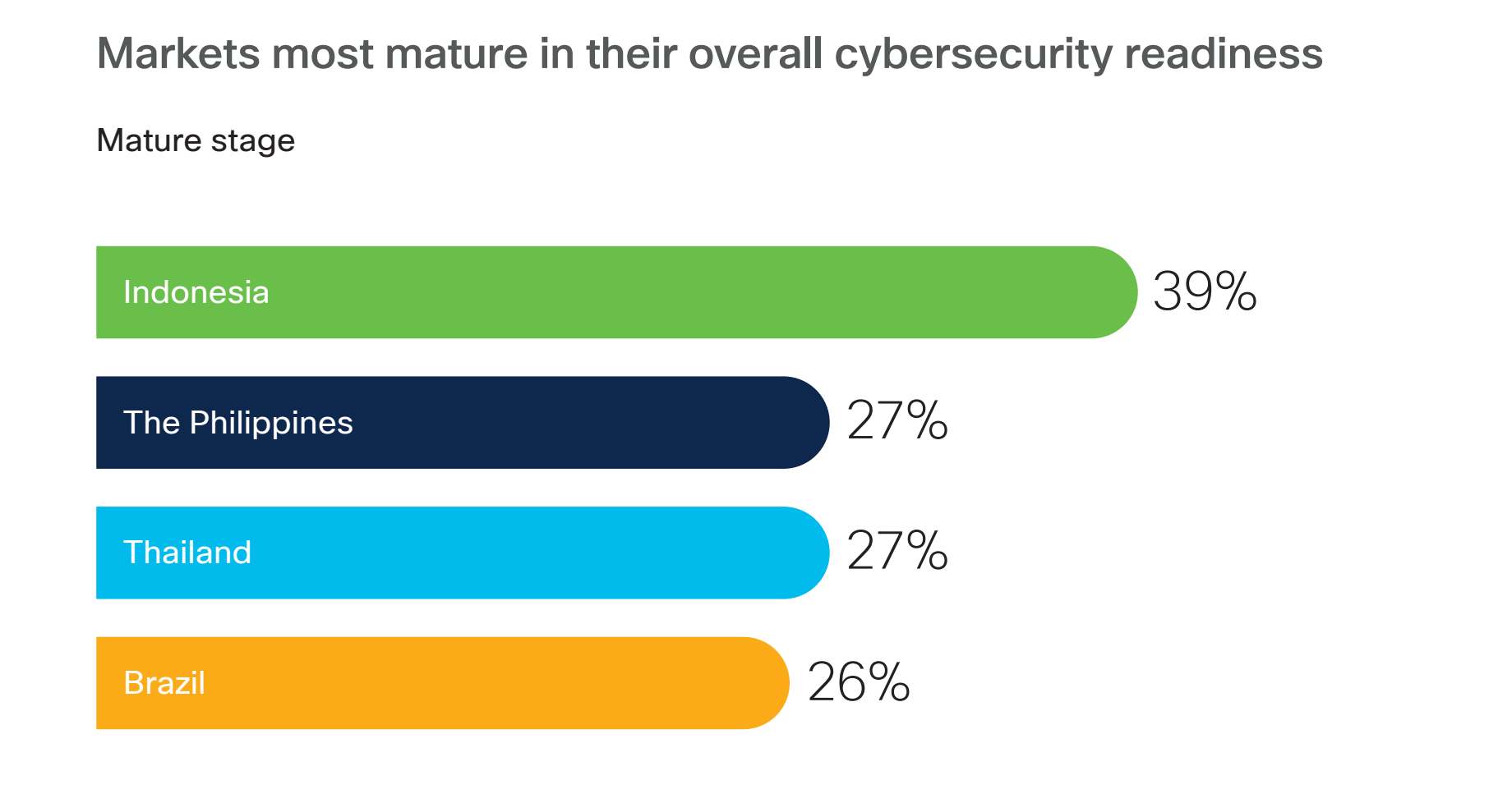 นอกเหนือจากการค้นพบว่ามีเพียง 27% ของบริษัทในไทยเท่านั้นที่มีความพร้อมอย่างเต็มที่ในการต่อสู้กับภัยคุกคามทางไซเบอร์ ยังพบอีกด้วยว่าเกือบ 40% ของบริษัทจัดอยู่ใน “ระดับเริ่มต้นหรือก่อร่างสร้างตัว” ขณะที่องค์กรในไทยทำได้ดีกว่าค่าเฉลี่ยทั่วโลก (15% ของบริษัททั่วโลกอยู่ในระดับพร้อมอย่างเต็มที่) แต่ตัวเลขก็ยังถือว่าต่ำมากเมื่อพิจารณาจากความเสี่ยงทางไซเบอร์