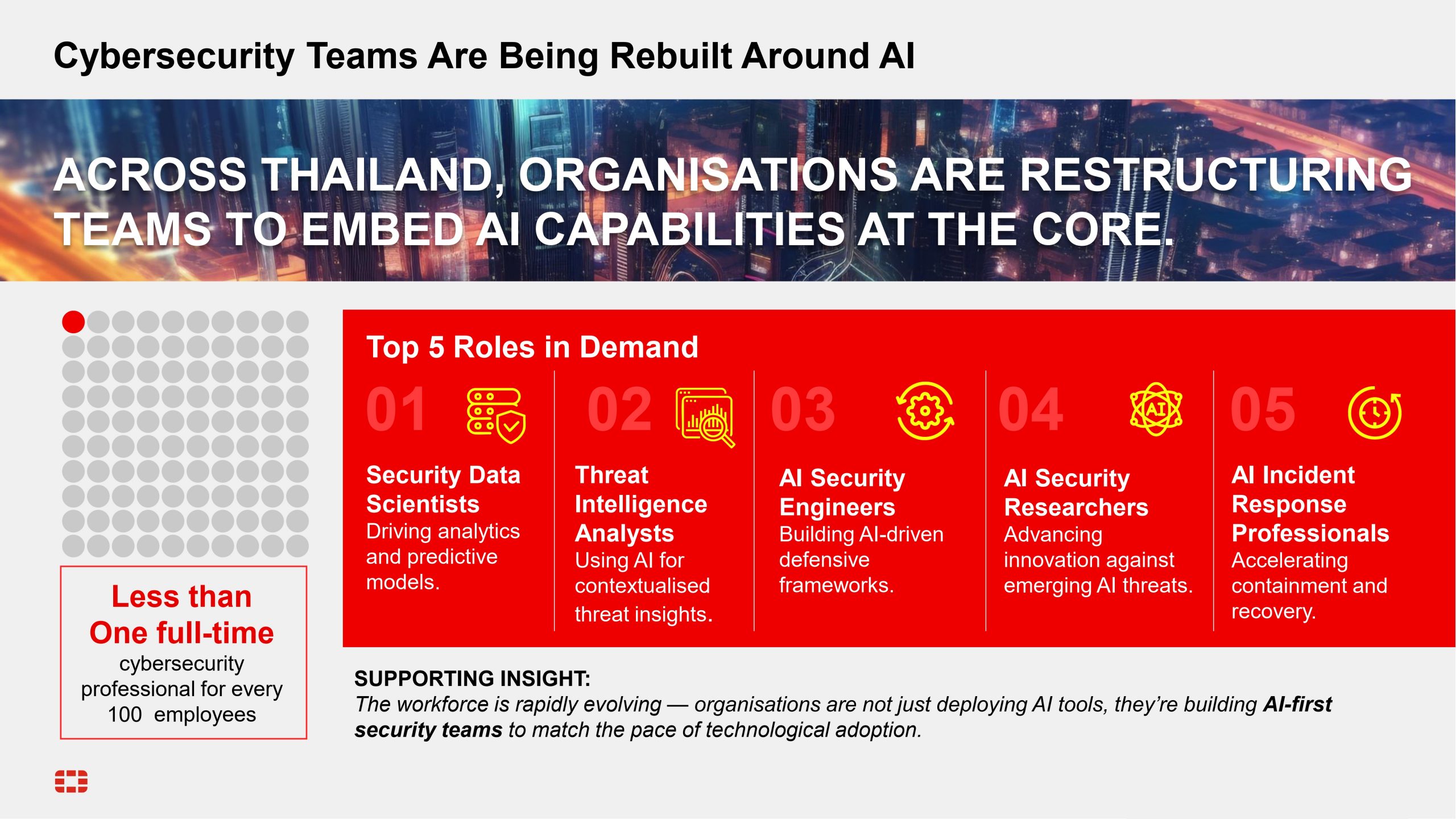 การเปลี่ยนสู่การรักษาความปลอดภัยไซเบอร์แบบ AI-first กำลังพลิกโฉมการสร้างทีมงานใหม่ สำหรับประเทศไทย งานด้านการรักษาความปลอดภัย 5 อันดับต้นที่กำลังเป็นที่ต้องการ ได้แก่ นักวิทยาศาสตร์ด้านความปลอดภัยข้อมูล นักวิเคราะห์ข่าวกรองภัยคุกคาม วิศวกรด้านความปลอดภัย AI นักวิจัยด้านความปลอดภัย AI และผู้เชี่ยวชาญด้านการตอบสนองต่อเหตุการณ์ด้วย AI โดยเฉพาะ