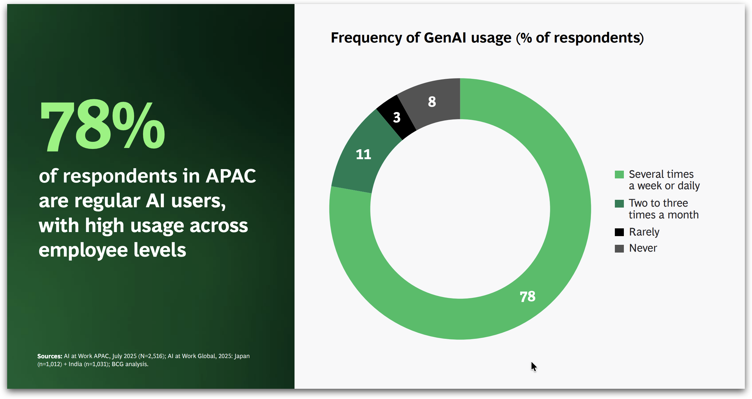 ปัจจุบัน ภูมิภาคเอเชียแปซิฟิกกำลังเป็นผู้กำหนดทิศทางในการแข่งขัน AI ระดับโลก ผู้เชี่ยวชาญในภูมิภาคที่ตอบแบบสำรวจจำนวน 78% ใช้ AI อย่างน้อยสัปดาห์ละครั้ง สูงกว่าตัวเลขระดับโลกที่ 72% ซึ่งเน้นย้ำถึงการนำ AI มาใช้ในกระบวนการทำงานประจำวันอย่างรวดเร็วและแพร่หลายในภูมิภาคนี้