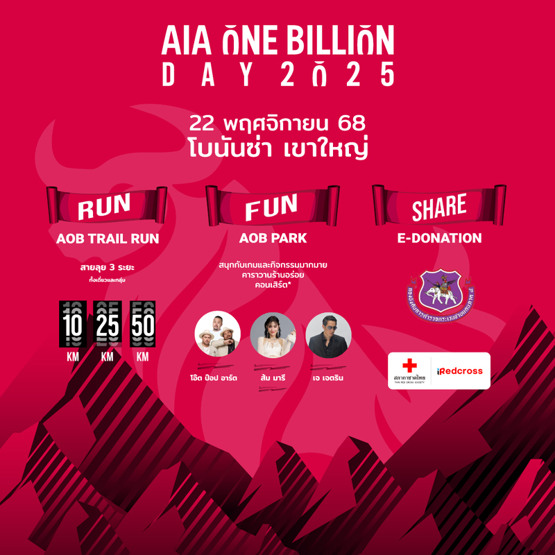 AIA ONE BILLION DAY 2025 เชิญชวนร่วมวิ่งเทรลสุดยิ่งใหญ่ ณ อุทยานแห่งชาติเขาใหญ่ ชิงถ้วยพระราชทานฯ พร้อมร่วม “วิ่งเพื่อให้” เพื่อสุขภาพดีและสังคมยั่งยืน