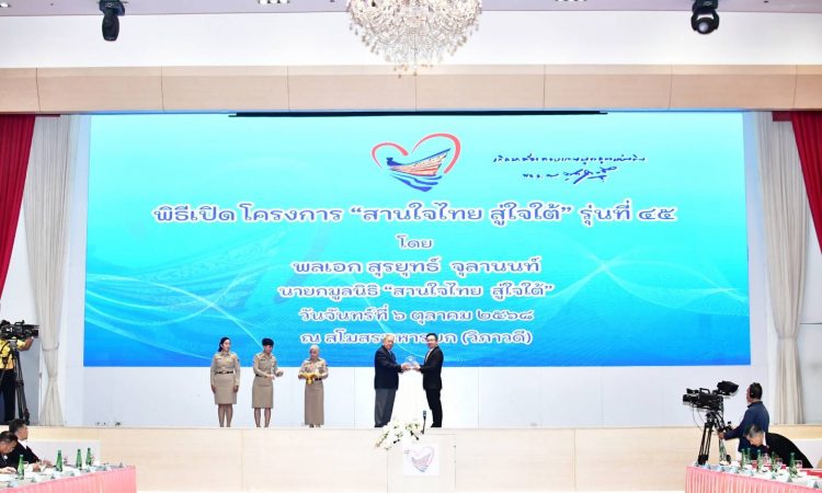 อไอเอ ประเทศไทย โดย สุวิรัช พงศ์เสาวภาคย์ ผู้อำนวยการฝ่ายกิจการภายนอก รับมอบโล่ประกาศเกียรติคุณจาก พลเอกสุรยุทธ์ จุลานนท์ ประธานองคมนตรี และนายกมูลนิธิ “สานใจไทย สู่ใจใต้” ในพิธีเปิดโครงการ “สานใจไทย สู่ใจใต้” รุ่นที่ 45 เพื่อเป็นการแสดงความขอบคุณที่ให้การสนับสนุนกรมธรรม์ประกันอุบัติเหตุกลุ่มฟรีแก่เยาวชนและครูพี่เลี้ยงที่เข้าร่วมโครงการ “สานใจไทย สู่ใจใต้” รุ่นที่ 45 โดยเอไอเอ ประเทศไทย ได้มอบกรมธรรม์ประกันอุบัติเหตุกลุ่มต่อเนื่องเป็นรุ่นที่ 5 จำนวน 470 กรมธรรม์ ประกอบด้วยเยาวชน 440 คน และครูพี่เลี้ยง 30 คน