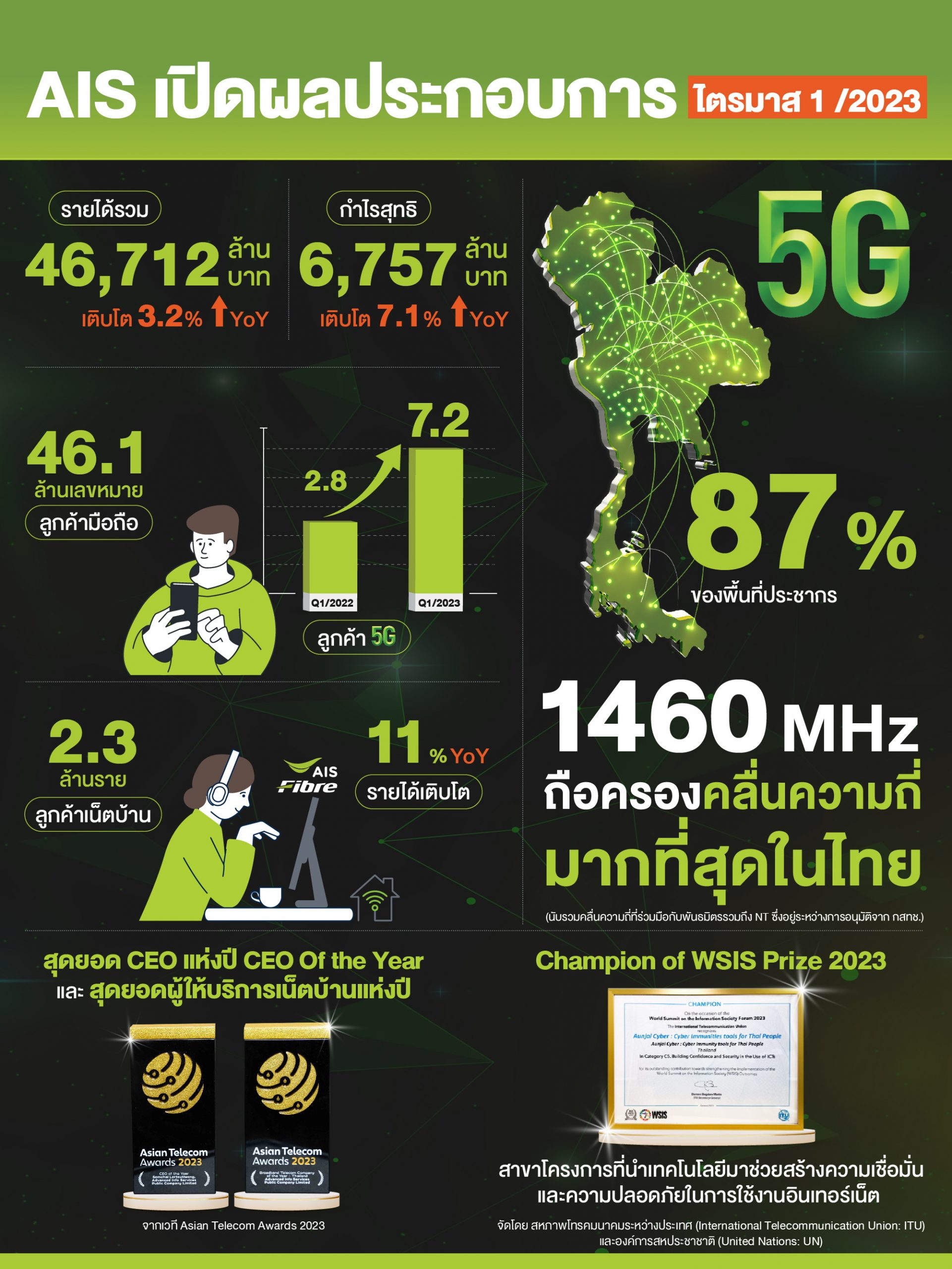 AIS ประกาศผลประกอบการไตรมาสแรกของปี 2566 ยังคงความแข็งแกร่งด้านผลประกอบการโดยมีรายได้รวม อยู่ที่ 46,712 ล้านบาท เติบโต 3.2% รวมถึงสามารถทำกำไรสุทธิที่ 6,757 ล้านบาท เติบโตขึ้น 7.1% เมื่อเทียบกับช่วงเดียวกันของปีที่ผ่านมา