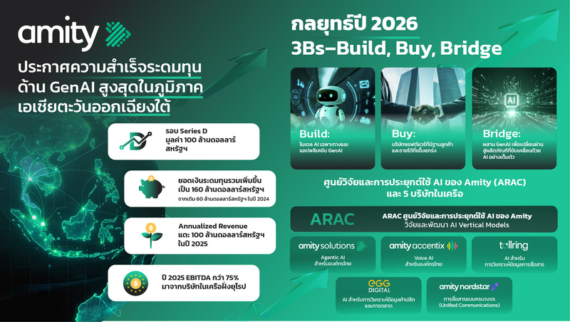 แต่จะเป็นระบบอัจฉริยะที่สามารถลงมือปฏิบัติงานและขับเคลื่อนกระบวนการทางธุรกิจได้จริง และท่ามกลางบริบทดังกล่าว อะมิตี้ ได้ประกาศความสำเร็จในการระดมทุนรอบ Series D ด้วยมูลค่ารวม 100 ล้านดอลลาร์สหรัฐ เพื่อเร่งการพัฒนา Vertical AI และ Agentic AI อย่างเต็มรูปแบบ ตอกย้ำศักยภาพในฐานะเทคคอมพานีสัญชาติไทยที่พร้อมแข่งขันในระดับโลก