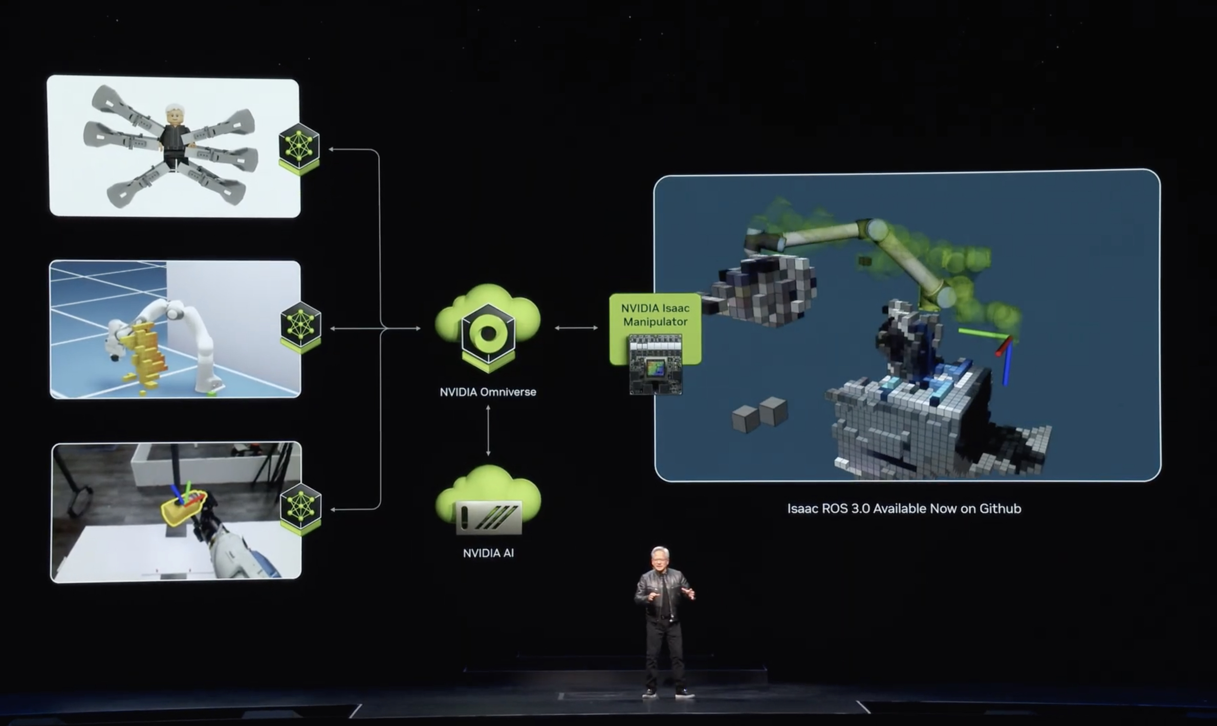 หวง เน้นย้ำถึงบทบาทของ NVIDIA_Isaac หรือ ชุดของแอปพลิเคชันที่ NVIDIA_สร้างสำหรับอัลกอริทึมหุ่นยนต์ ในการเพิ่มประสิทธิภาพของโรงงานและคลังสินค้า โดยผู้นำระดับโลกอย่าง BYD Electronics, Siemens, Teradyne Robotics และ Intrinsic นำไลบรารีขั้นสูงและโมเดล AI มาใช้
