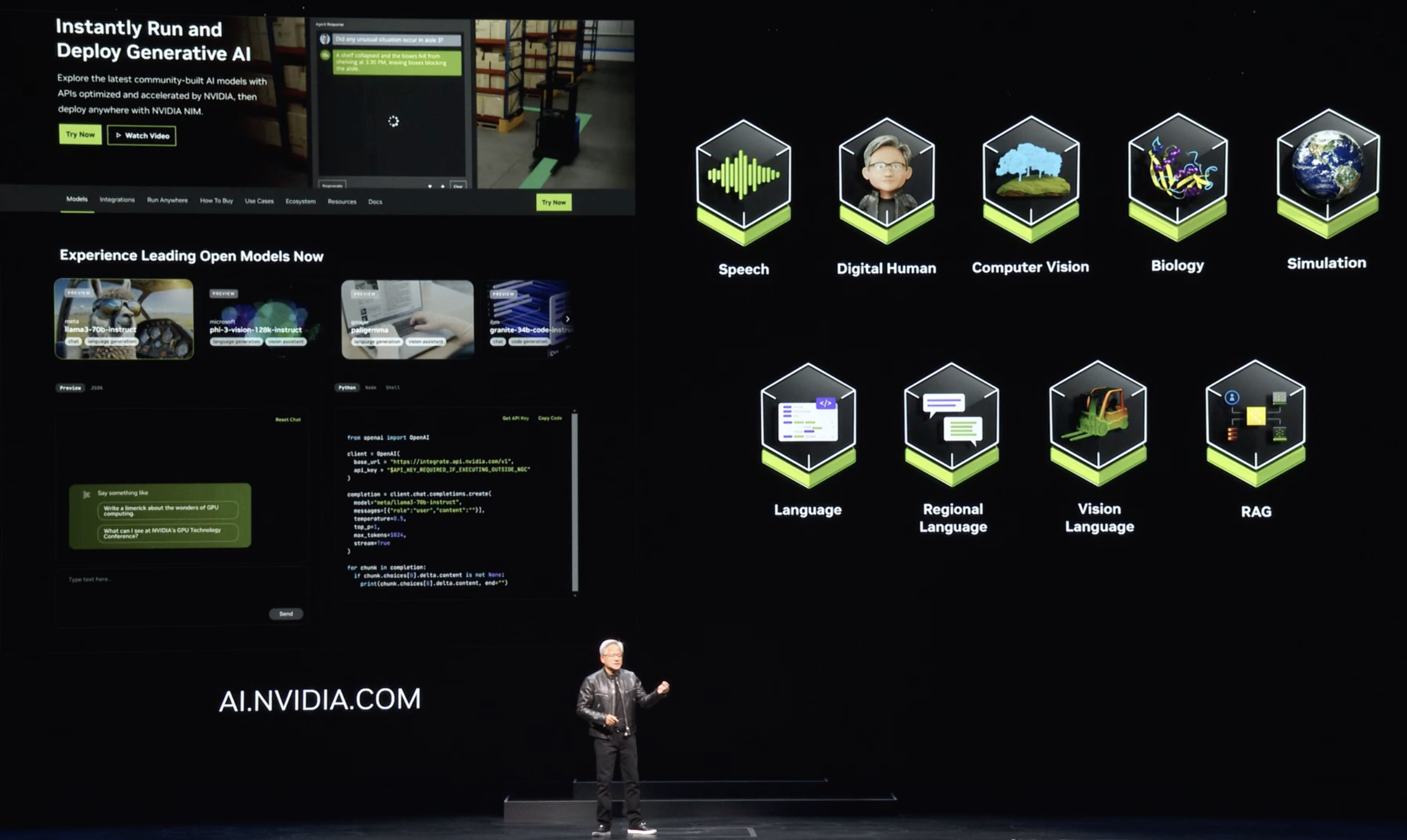 ด้วย NVIDIA_NIM นักพัฒนากว่า 28 ล้านคนทั่วโลกสามารถสร้างแอปพลิเคชัน AI เจนเนอเรทีฟได้อย่างง่ายดาย โดย NIM ซึ่งเป็นไมโครเซอร์วิสที่ให้แบบจำลอง เป็นคอนเทนเนอร์ที่ปรับให้เหมาะสม สามารถนำไปใช้งานบนคลาวด์ ศูนย์ข้อมูล หรือเวิร์กสเตชันได้