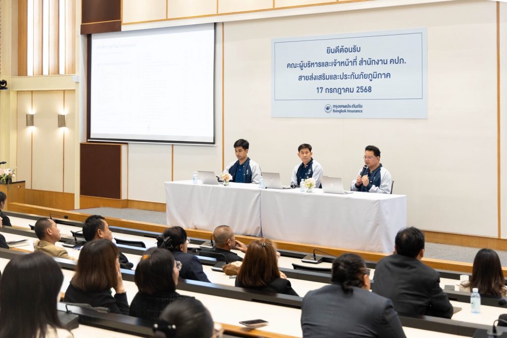 ดร.อภิสิทธิ์ อนันตนาถรัตน กรรมการและประธานคณะผู้บริหาร บริษัท กรุงเทพประกันภัย จำกัด (มหาชน) และคณะผู้บริหารให้การต้อนรับ วสุมดี วสีนนท์ รองเลขาธิการ ด้านกำกับคนกลางและประกันภัยภูมิภาค วิไลรัตน์ แสงแก้ว ผู้ช่วยเลขาธิการ สายส่งเสริมและประกันภัยภูมิภาค พร้อมด้วยคณะผู้บริหารและเจ้าหน้าที่สายส่งเสริมและประกันภัยภูมิภาค สำนักงานคณะกรรมการกำกับและส่งเสริมการประกอบธุรกิจประกันภัย หรือสำนักงาน คปภ. จำนวนกว่า 70 คน ในโอกาสที่ให้ความสนใจเข้าเยี่ยมชมดูงาน ณ อาคารกรุงเทพประกันภัย ถนนสาทรใต้ เมื่อวันที่ 17 กรกฎาคม 2568