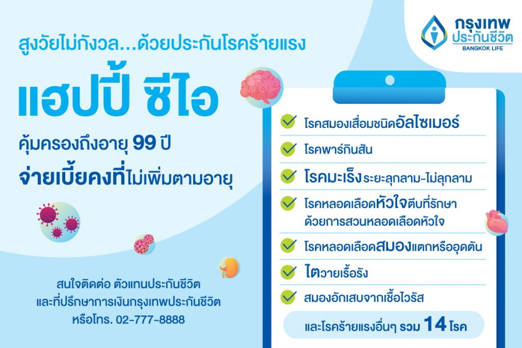 โดยปัจจุบัน บริษัทฯ ได้พัฒนาแบบประกัน “แฮปปี้ ซีไอ” ซึ่งเป็นสัญญาเพิ่มเติมที่ให้ความคุ้มครองโรคร้ายแรงที่มักพบบ่อย 6 กลุ่ม ซึ่งนอกจากจะให้ความคุ้มครองกลุ่มโรคที่มักเกิดขึ้นกับผู้สูงอายุอย่างโรคสมองเสื่อมชนิดอัลไซเมอร์และโรคพาร์กินสันแล้ว ยังรวมไปถึงกลุ่มโรคมะเร็งและเนื้องอก กลุ่มโรคที่เกียวกับหัวใจและหลอดเลือด กลุ่มโรคที่เกียวกับเส้นเลือดสมองและระบบประสาท กลุ่มโรคที่เกียวกับไต กลุ่มโรคที่เกียวกับการติดเชื้ออย่างรุนแรง