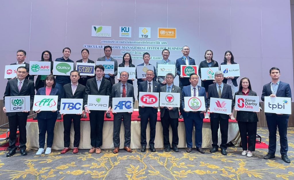 สำหรับการมอบใบรับรองมาตรฐานดังกล่าว จัดขึ้นภายในงานแถลงข่าว CIRCULAR ECONOMY: From Policy to Practice for Business Organizations เพื่อเผยแพร่ความสำเร็จของโครงการวิจัยของ บพข. ซึ่งดำเนินการโดย ศูนย์เชี่ยวชาญเฉพาะทางด้านกลยุทธ์ธุรกิจที่เป็นมิตรต่อสิ่งแวดล้อม (วีกรีน) คณะสิ่งแวดล้อม มหาวิทยาลัยเกษตรศาสตร์ ร่วมกับสำนักงานมาตรฐานอุตสาหกรรม (สมอ.) กระทรวงอุตสาหกรรม โดยมี รศ.ดร.รัตนาวรรณ มั่งคั่ง ผู้อำนวยการ วีกรีน เป็นหัวหน้าโครงการ ฯ มีวัตถุประสงค์เพื่อผลักดันและขับเคลื่อนนโยบายเศรษฐกิจหมุนเวียนระดับชาติสู่การประยุกต์ใช้แนวคิดเศรษฐกิจหมุนเวียนในภาคเอกชนอย่างเป็นรูปธรรม