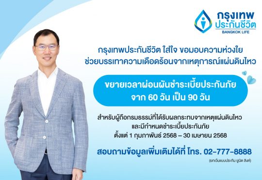 Movementกรุงเทพประกันชีวิต ออกมาตรการช่วยเหลือลูกค้าได้รับผลกระทบจากเหตุแผ่นดินไหว ขยายระยะเวลาผ่อนผันการชำระเบี้ยและการผ่อนผันCWB02/04/202504/04/2025Movementบริษัท กรุงเทพประกันชีวิต จำกัด (มหาชน) หรือ กรุงเทพประกันชีวิต ขอแสดงความห่วงใยพี่น้องประชาชนต่อกรณีเหตุการณ์แผ่นดินไหวในประเทศไทยเมื่อวันศุกร์ที่ 28 มีนาคมที่ผ่านมา...