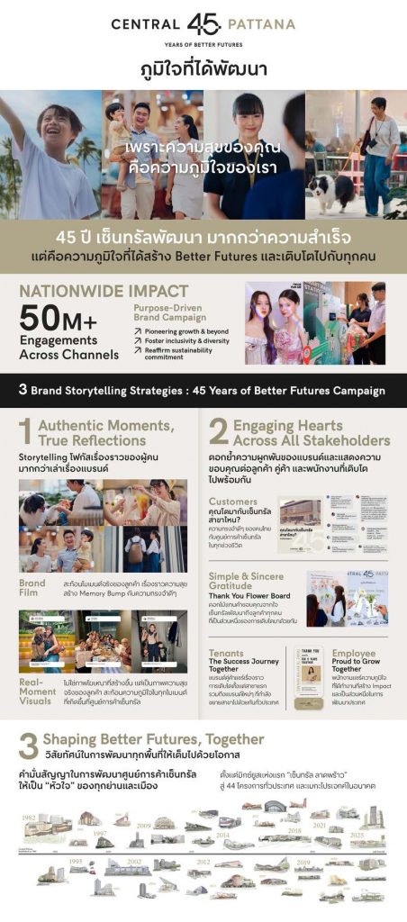 “เซ็นทรัลพัฒนา ถ่ายทอดเรื่องราวความ ภูมิใจที่ได้พัฒนา ตลอด 45 ปี ผ่าน Brand Campaign สะท้อนภาพ ความสุขของผู้คน คือความภูมิใจของเรา และการเป็นมากกว่าศูนย์การค้าแต่เป็น หัวใจของเมือง ที่เติบโตไปด้วยกัน