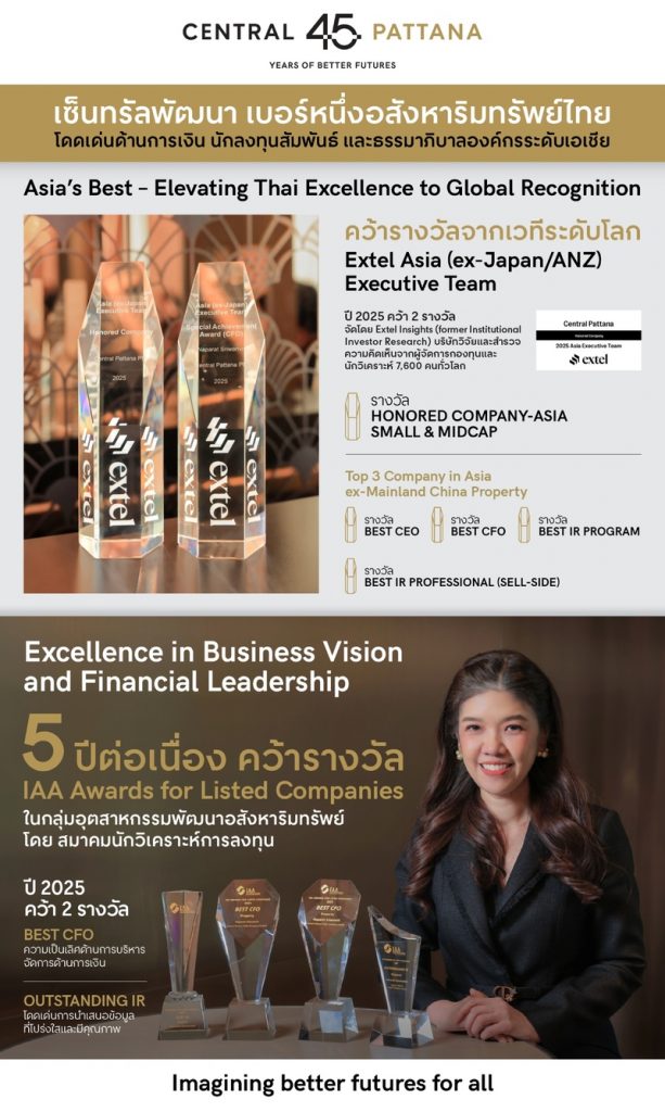 จากเวที 2025 Extel Asia (ex-Japan/ANZ) Executive Team Awards จัดโดย Extel Insights บริษัทวิจัยชั้นนำระดับโลก เซ็นทรัลพัฒนาเป็นบริษัทอสังหาฯ ไทยเพียงแห่งเดียวที่ติด Top 3 ในกลุ่ม Asia ex-Mainland China Property Sector ได้รับรางวัล
