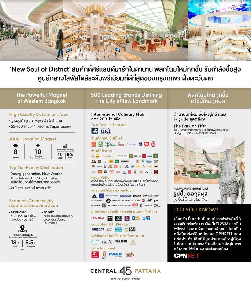 ศูนย์การค้าเซ็นทรัล ปิ่นเกล้า ประสบความสำเร็จอย่างต่อเนื่อง เป็นหนึ่งในทรัพย์สินหลักและเป็นแรงขับเคลื่อนสำคัญในการสร้างรายได้ที่มั่นคงและเสริมศักยภาพการเติบโตของกองทรัสต์ฯ CPNREIT ในระยะยาว เตรียมพบกับงานฉลองเปิดโฉมใหม่เต็มรูปแบบในวันที่ 6 พฤศจิกายน 2568 นี้ ณ ศูนย์การค้าเซ็นทรัล ปิ่นเกล้า