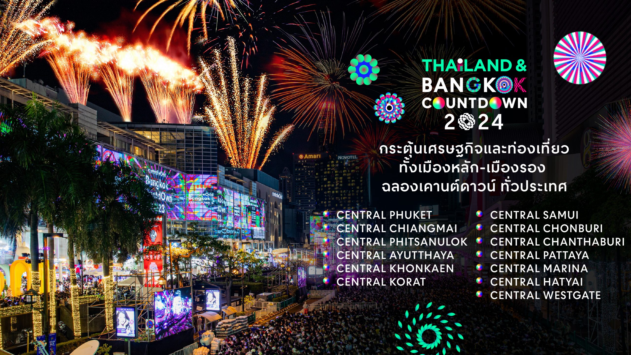 พร้อมกับจัด Thailand Countdown 2024 งานฉลองเคานต์ดาวน์ทั่วประประเทศ ณ ศูนย์การค้าเซ็นทรัล 13 สาขา ได้แก่ ภูเก็ต, สมุย, หาดใหญ่, เชียงใหม่, พิษณุโลก, อยุธยา, ขอนแก่น, โคราช, พัทยา, มารีนา, จันทบุรี, ชลบุรี และเวสต์เกต