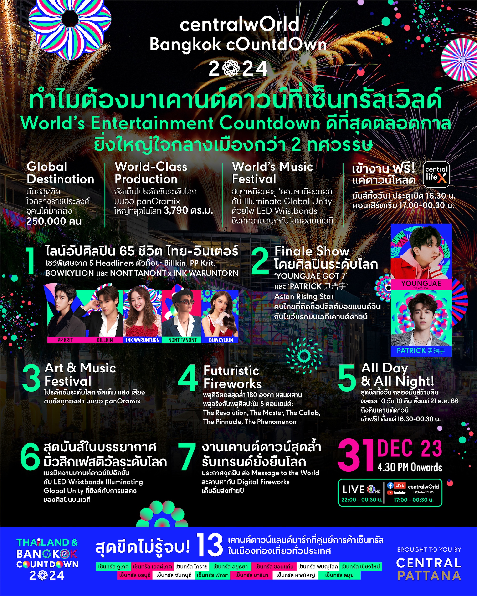 เตรียมเปิดปรากฎการณ์ Countdown Entertainment พร้อมกันทั่วประเทศ ผ่านการถ่ายทอดสด ทางช่อง 3HD ตั้งแต่เวลา 22.30-00.30 น. หรือรับชมแบบออนไลน์ผ่านเพจพันธมิตร และ Multi View ผ่าน FB และ YouTube ของสาขา Central World ตั้งแต่เวลา 19.00-00.30 น. ในคืนวันที่ 31 ธันวาคม 2566 นี้