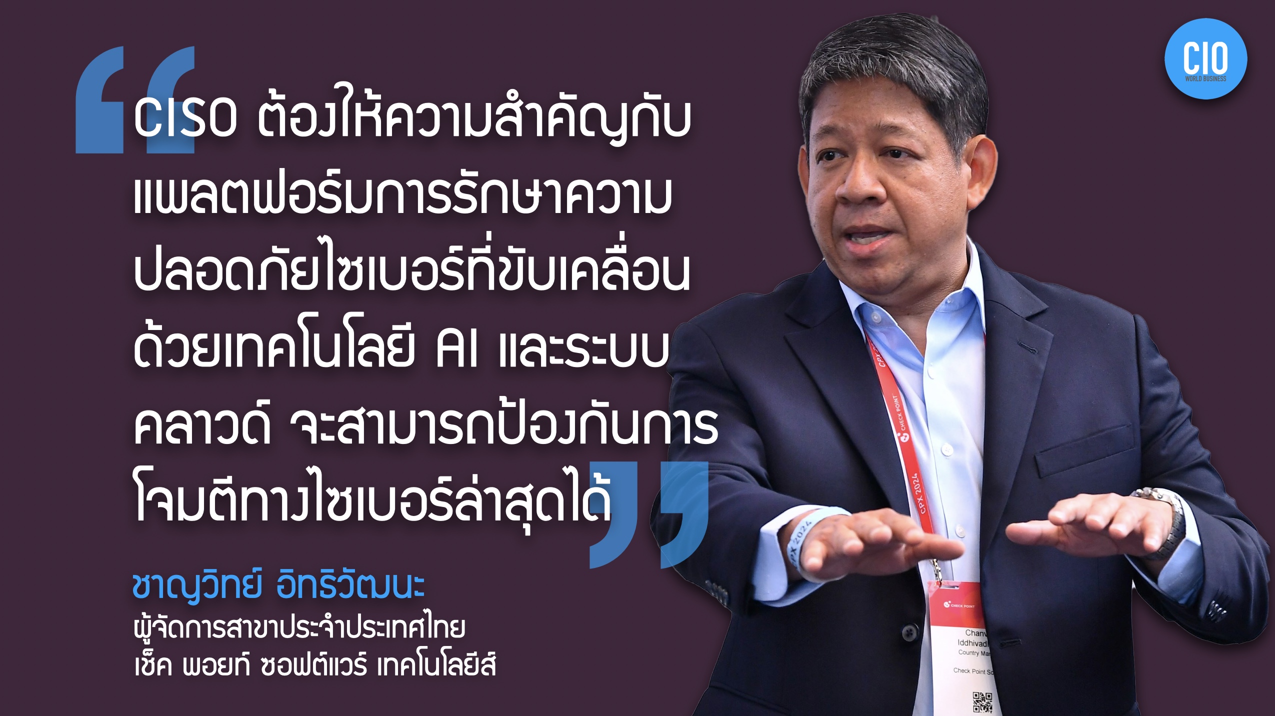 “ชาญวิทย์ อิทธิวัฒนะ ผู้จัดการประจำประเทศไทย เช็ค พอยท์ ซอฟต์แวร์ แนะนำ CISO มองหาแพลตฟอร์มความปลอดภัยไซเบอร์ที่มี AI และระบบคลาวด์ สถิติพบประเทศไทยเป็นเป้าถูกโจมตี หน่วยงานรัฐ การทหารเป็นกลุ่มเป้าหมายที่ถูกโจมตี
