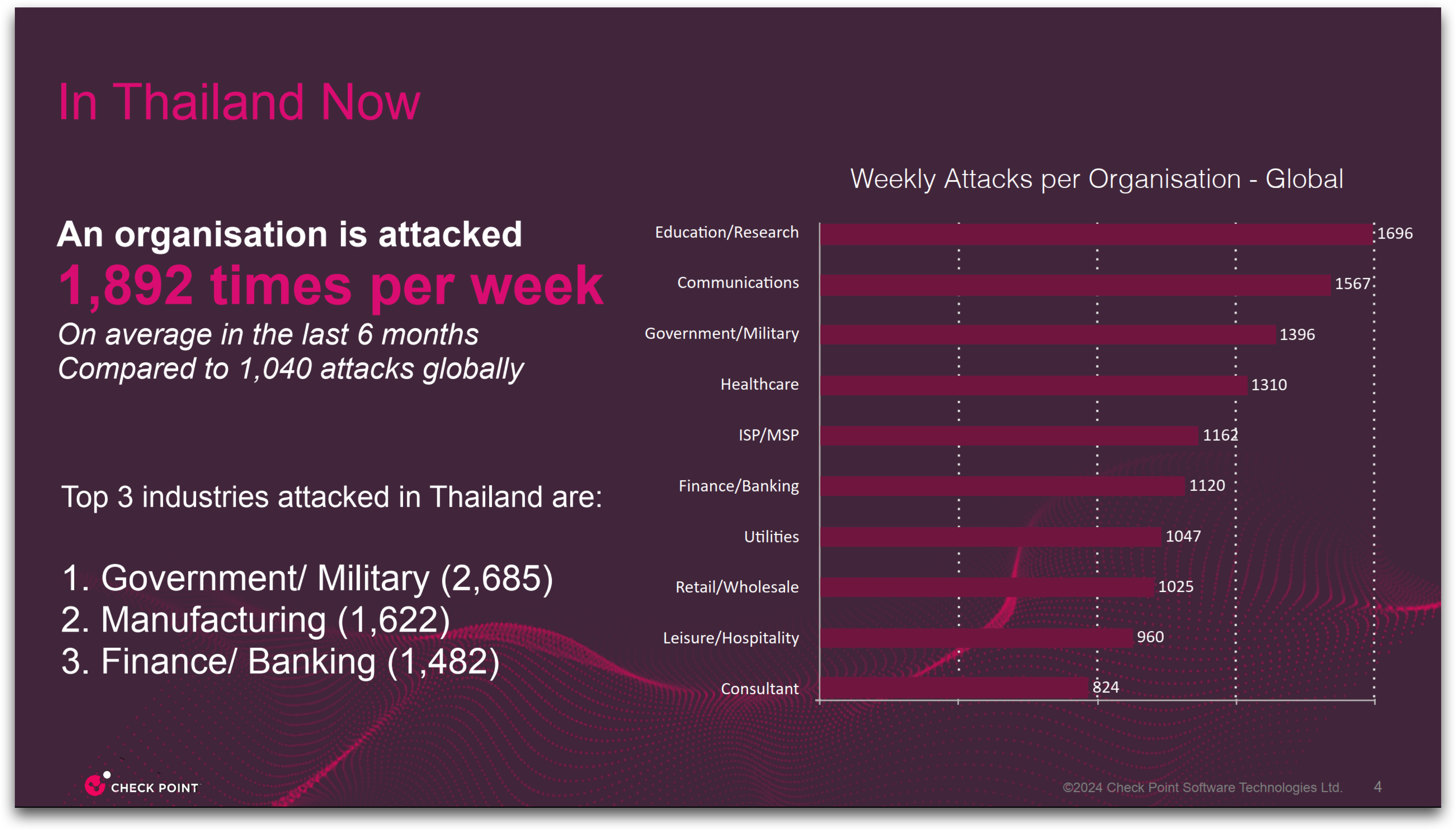 บริษัท เช็ค พอยท์ ซอฟต์แวร์ เทคโนโลยีส์ จำกัด ผู้ให้บริการโซลูชันการรักษาความปลอดภัยทางไซเบอร์ระดับโลก เปิดเผยว่า องค์กรในประเทศไทยถูกโจมตีทางไซเบอร์มากถึง 1,892 ครั้งต่อสัปดาห์ในช่วงครึ่งปีที่ผ่านมา (กรกฎาคม – ธันวาคม 2566) ถือว่าอยู่ในระดับที่สูงอย่างน่าตกใจเมื่อเทียบกับค่าเฉลี่ยทั่วโลกที่ระดับ 1,040 ครั้ง