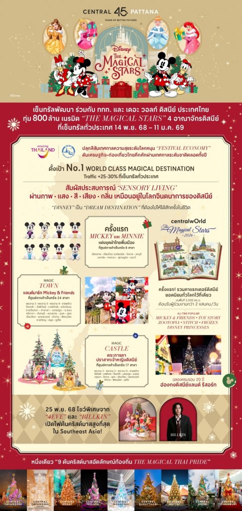 ริษัท เซ็นทรัลพัฒนา จำกัด (มหาชน) ผู้นำอันดับหนึ่งอสังหาริมทรัพย์ไทยเพื่อความยั่งยืน และผู้พัฒนาศูนย์การค้าเซ็นทรัลทั่วประเทศ จับมือ การท่องเที่ยวแห่งประเทศไทย (ททท.) และ เดอะ วอลท์ ดิสนีย์ ประเทศไทย ทุ่มงบกว่า 800 ล้านบาท สร้างปรากฏการณ์แห่งความสุขระดับโลกส่งท้ายปีในแคมเปญ “The Magical Stars” เนรมิต 4 อาณาจักรเทพนิยายธีมดิสนีย์ ได้แก่ ต้นคริสต์มาสอัตลักษณ์ และ “มิคกี้และมินนี่” สูง 3 เมตร ในชุดผ้าไทย, Disney The Magical Stars 2026 at centralwOrld, Magic Town ธีมมิคกี้ เมาส์ และ Magic Castle ธีมปราสาทเจ้าหญิงดิสนีย์ เพื่อร่วมขับเคลื่อนเศรษฐกิจและการท่องเที่ยวไทยช่วงปลายปี ผ่านแนวคิด Festival Economy ปลุกบรรยากาศท่องเที่ยวให้คึกคัก เชื่อมโยงความสุขจากศูนย์การค้าเซ็นทรัลทั่วประเทศ