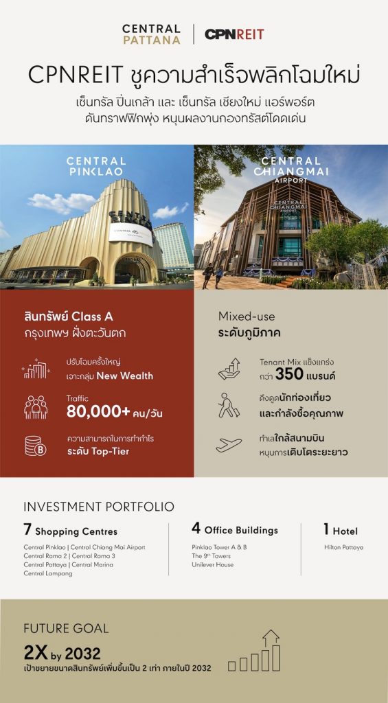 CPNREIT สะท้อนแนวคิดการบริหารกองทรัสต์ให้เติบโตอย่างยั่งยืน ผ่านการพัฒนาสินทรัพย์อย่างต่อเนื่อง โดยทุกการทรานส์ฟอร์มเป็นการยกระดับสินทรัพย์ในเชิงโครงสร้าง เพื่อเสริมศักยภาพและความแข็งแกร่งของกองทรัสต์ โดยสะท้อนจาก 2 สินทรัพย์ ได้แก่