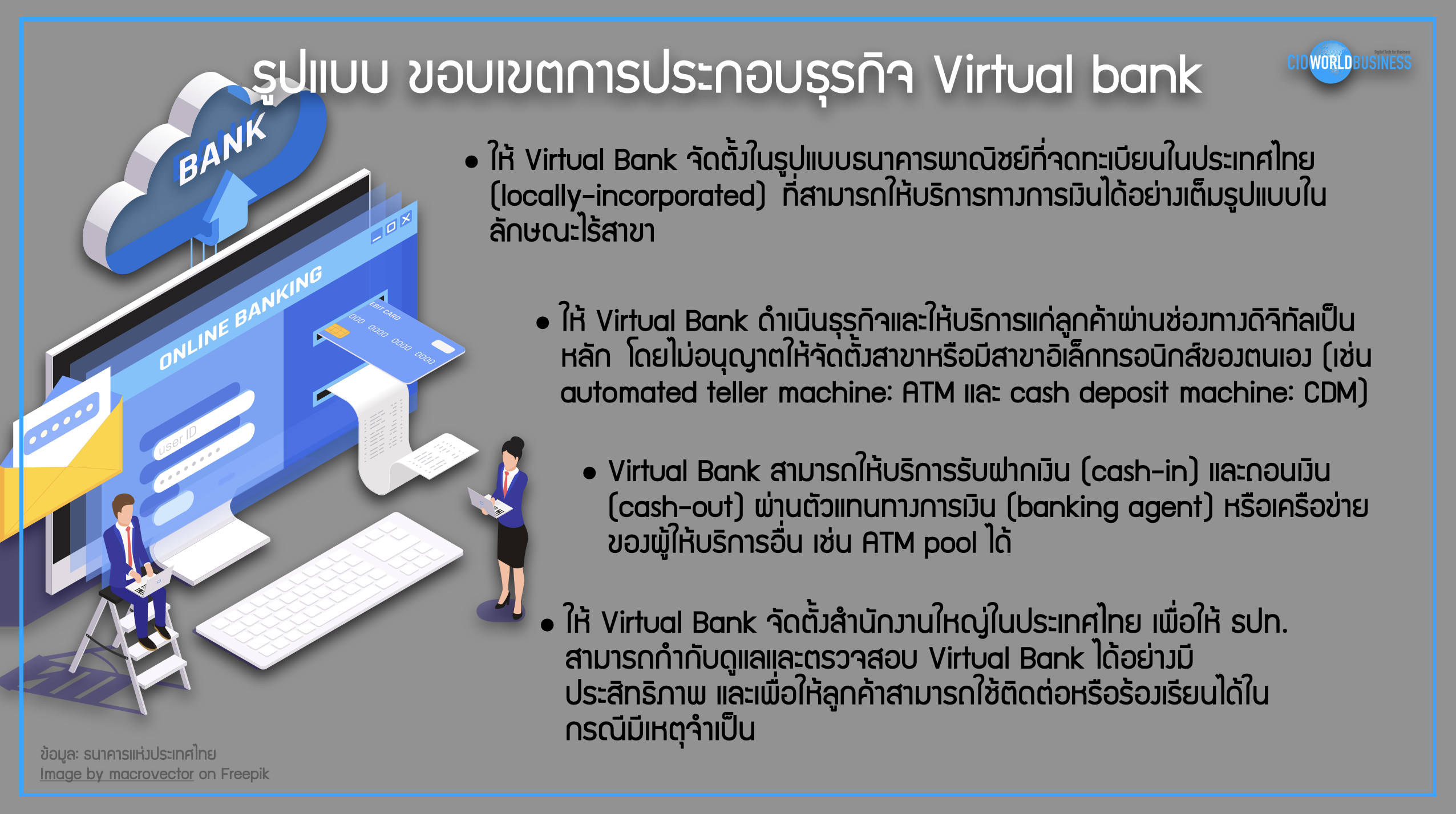 เมื่อเร็วๆ นี้ ธนาคารแห่งประเทศไทยได้ประชาสัมพันธ์ แนวทางการอนุญาตให้จัดตั้งธนาคารพาณิชย์ไร้สาขา (Virtual Bank) ที่คาดว่าจะเริ่มให้บริการในปี 2568 โดยมีวัตถุประสงค์เพื่อลดความเหลื่อมล้ำในการเข้าถึงแหล่งเงินทุนของลูกค้าบุคคลและธุรกิจรายย่อย