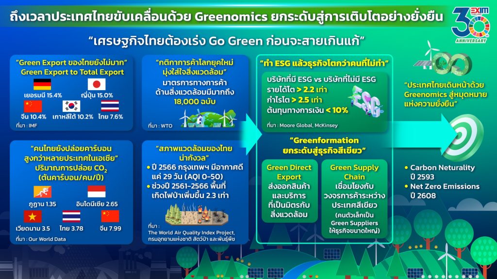 เนื่องจากธุรกิจที่คำนึงถึง ESG มีการเติบโตของรายได้และกำไรมากกว่าธุรกิจทั่วไปกว่า 2 เท่าตัว EXIM BANK ในฐานะสถาบันการเงินเฉพาะกิจของรัฐภายใต้การกำกับดูแลของกระทรวงการคลังจึงสานพลังกับภาครัฐและภาคเอกชนขับเคลื่อนประเทศไทยสู่สังคมคาร์บอนต่ำ เพื่ออนาคตของประเทศไทยและโลกที่ยั่งยืน ภายใต้บทบาท Green Development Bank ด้วยกลยุทธ์ “Greenovation” ที่จะสร้าง Green Supply Chain ขับเคลื่อนการค้าและการลงทุน เปลี่ยนแปลงประเทศไทยไปสู่เศรษฐกิจสีเขียว(Greenomics)