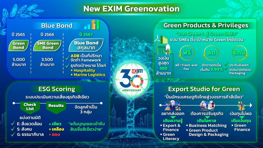 อาทิ พลังงานหมุนเวียน EV เคมีชีวภาพ อุตสาหกรรมเกษตรและประมงแปรรูป และธุรกิจบริการและ Soft Power อาทิ การท่องเที่ยวเชิงนิเวศ และนวัตกรรมอาหารแห่งอนาคต ควบคู่กับการสร้างผู้ส่งออกไทย โดยออกผลิตภัณฑ์ใหม่ด้าน Climate Finance ได้แก่ EXIM Green Goal ส่งเสริมให้ SMEs ตั้งเป้าหมาย Green ให้ชัดเจนและพร้อมเข้าร่วม Green Supply Chain