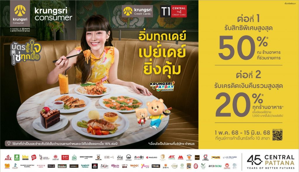วันนี้กินอะไรดี? คำถามสุดฮิตที่วนมาไม่รู้จบ… เซ็นทรัลพัฒนา ” จับมือกับบัตรเครดิตกรุงศรี และบัตรเครดิตเซ็นทรัล เดอะวัน ชวนคุณเปลี่ยนทุกมื้อให้เป็นโมเมนต์สุดฟิน ด้วยแคมเปญ “อิ่มทุกเดย์ เปย์เดย์ยิ่งคุ้ม” เติมความสุขให้ทุกจาน พร้อมดีลพิเศษสุดคุ้ม ที่ศูนย์การค้าเซ็นทรัล 10 สาขาทั่วประเทศ ตั้งแต่วันนี้ – 15 มิ.ย. 68 ไม่ว่าจะมื้อเร่งรีบ มื้อชิล หรือมื้อพิเศษ… ก็เลือกความอร่อยแบบที่ใช่ พร้อมรับสิทธิ์สุดคุ้มได้ทุกวัน!