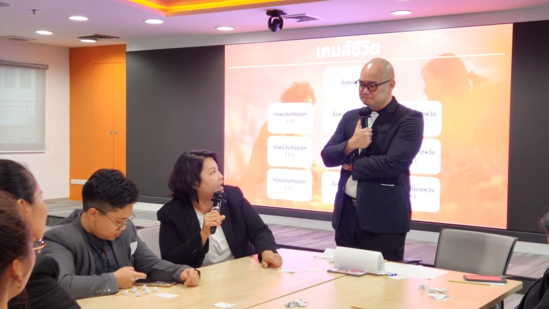จากนั้นลงลึกไปในเนื้อหาเรื่อง ประกันภัย การบริหารความเสี่ยง ผ่านการเล่นเกม Risky Lossy ที่จำลองสถานการณ์ความเสี่ยงในชีวิตให้เห็นความสำคัญของการเตรียมความพร้อม ด้วยเครื่องมือทางการเงินที่เหมาะสม ทำให้ครูได้เห็นตัวเองในมุมที่ไม่เคยรู้มาก่อน ทั้งจุดแข็ง จุดอ่อน และนิสัยการใช้เงินที่ควรปรับ