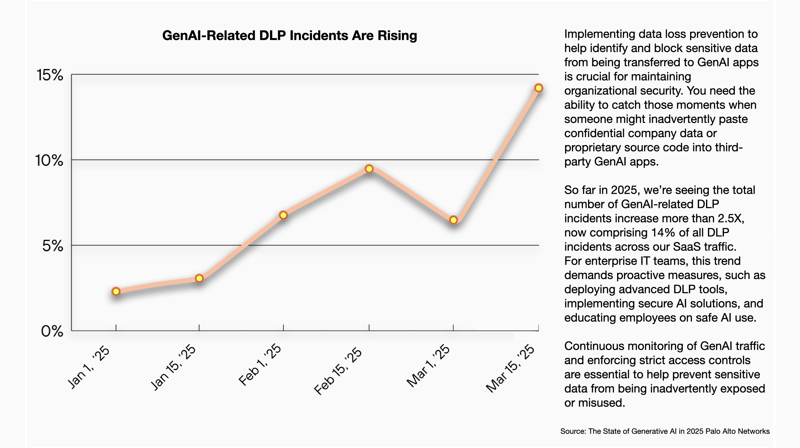 - ปัญหาข้อมูลรั่วไหลเพิ่มขึ้น: เกิดเหตุการณ์ด้านการป้องกันข้อมูลสูญหาย (Data Loss Prevention) ที่เกี่ยวข้องกับ GenAI เพิ่มขึ้นมากกว่าสองเท่า โดยปัจจุบันคิดเป็น 14% ของเหตุการณ์ด้านความปลอดภัยทางข้อมูลทั้งหมด