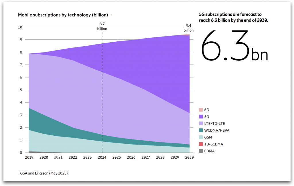 อีริคสัน คาดการณ์ว่า ภายในสิ้นปี 2030 จำนวนบัญชีผู้ใช้บริการ 5G ทั่วโลก จะสูงถึง 6.3 พันล้านราย โดยอ้างจากรายงาน Ericsson Mobility Report (ฉบับเดือนมิถุนายน 2025) และคาดว่าสิ้นปี 2025 บัญชีผู้ใช้ 5G ทั่วโลกจะเพิ่มเป็น 2.9 พันล้านราย หรือคิดเป็น 1 ใน 3 ของยอดผู้ใช้บริการมือถือทั้งหมด