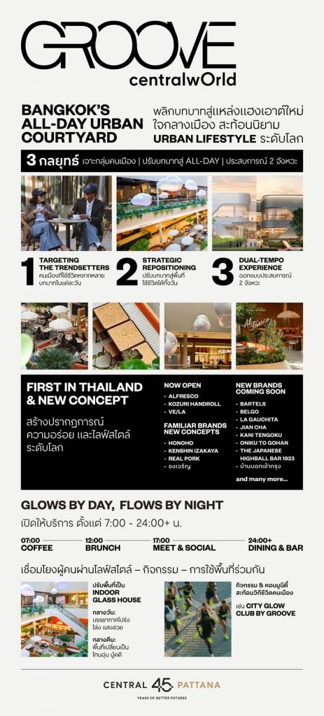 บริษัท เซ็นทรัลพัฒนา จำกัด (มหาชน) ผู้บริหารศูนย์การค้าเซ็นทรัลเวิลด์ ไลฟ์สไตล์แลนด์มาร์กระดับโลกใจกลางกรุงเทพฯ เดินหน้าพลิกบทบาท Groove ใหม่ทั้งหมด จากพื้นที่ที่เคยสร้าง Talk of the Town มาแล้วทั่วเมือง สู่โมเดล Bangkok’s All-Day Urban Courtyard ตอบรับทิศทางการใช้ชีวิตของคนเมืองยุคใหม่ที่เปลี่ยนไปอย่างชัดเจน