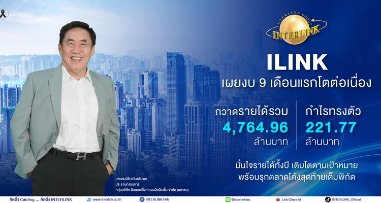 “ILINK เผยงบ 9 เดือนแรกโตต่อเนื่อง กวาดรายได้รวม 4,764.96 ล้านบาท กำไรทรงตัว 221.77 ล้านบาท มั่นใจรายได้ทั้งปี เติบโตตามเป้าหมาย พร้อมรุกตลาดโค้งสุดท้ายเต็มพิกัด