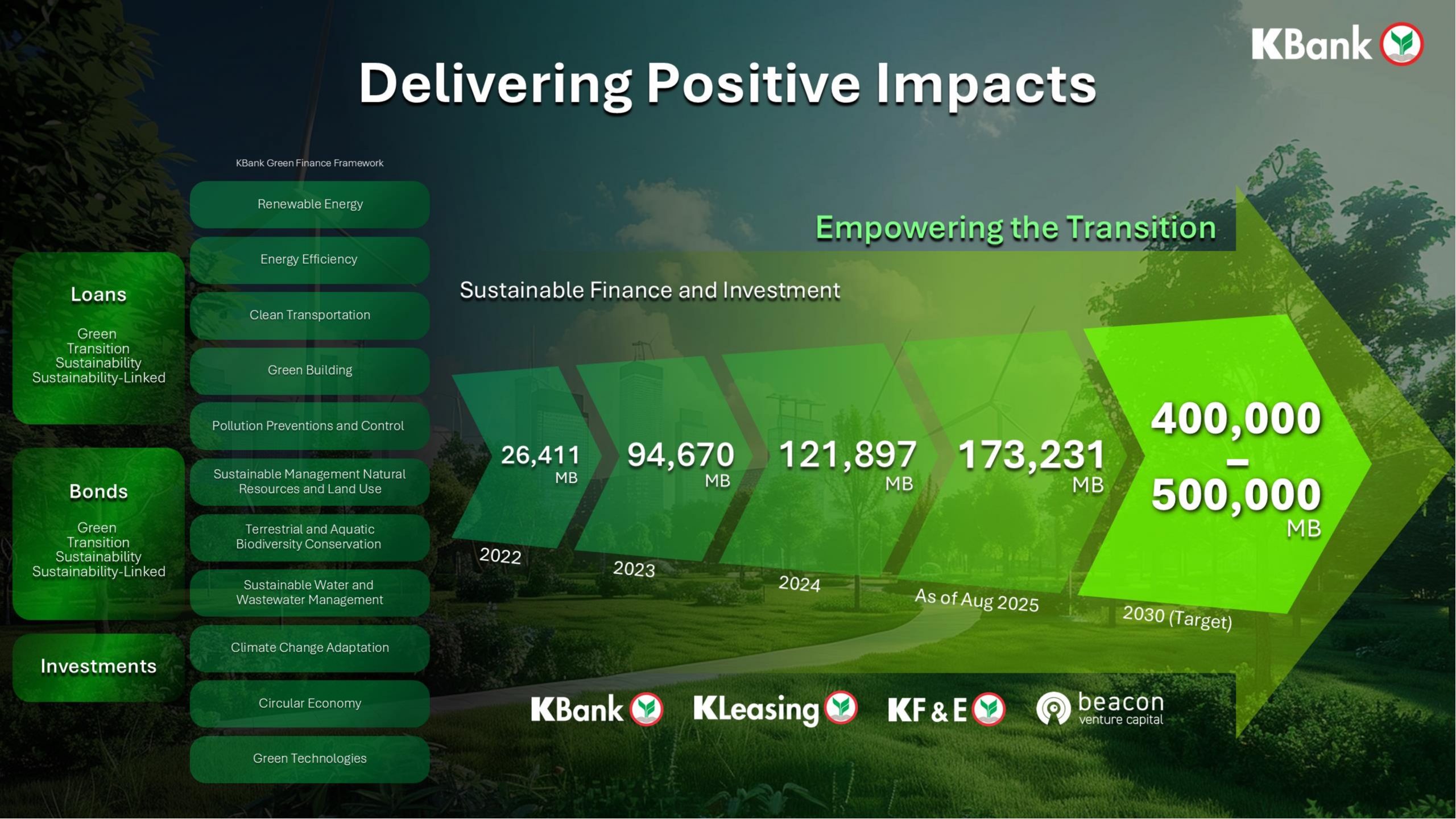 - การสนับสนุนให้ลูกค้าสามารถเปลี่ยนผ่านสู่ธุรกิจคาร์บอนต่ำ ด้วยการสนับสนุนทั้งด้านการเงิน ความรู้ และเทคโนโลยี ผ่านการปล่อยสินเชื่อและการลงทุน โดยมียอดสะสมของสินเชื่อและการลงทุนเพื่อความยั่งยืนกว่า 173,231 ล้านบาท (ณ สิงหาคม 2568) และสามารถช่วยลดการปล่อยก๊าซเรือนกระจกได้มากกว่า 2.74 ล้านตันคาร์บอนไดออกไซด์เทียบเท่า ประกอบด้วยสินเชื่อรถยนต์ไฟฟ้ากว่า 39,000 คัน สินเชื่อเพื่ออาคารสีเขียวมากกว่า 1 ล้านตารางเมตร สินเชื่อสำหรับโครงการทางธุรกิจเพื่อความยั่งยืนกว่า 500 โครงการ รวมถึงการดำเนินงานในมิติ Beyond Banking