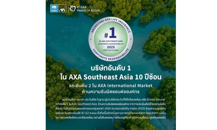 บมจ.กรุงไทย-แอกซ่า ประกันชีวิต ในฐานะผู้นำบริษัทประกันที่ใส่ใจสิ่งแวดล้อม หรือ Green Insurer ด้วยความสำเร็จที่ภาคภูมิใจจากการคว้าอันดับ 1 ในเอเชียอาคเนย์ต่อเนื่อง 10 ปีซ้อน และอันดับ 2 ใน AXA International Market ด้านความรับผิดชอบต่อองค์กร จากการประเมินดัชนีชี้วัดความยั่งยืนด้านความรับผิดชอบต่อองค์กรของกลุ่มแอกซ่า (AXA Sustainability Index 2025) ด้วยคะแนนสูงสุดในเอเชียตะวันออกเฉียงใต้ ที่ 87.62 คะแนน