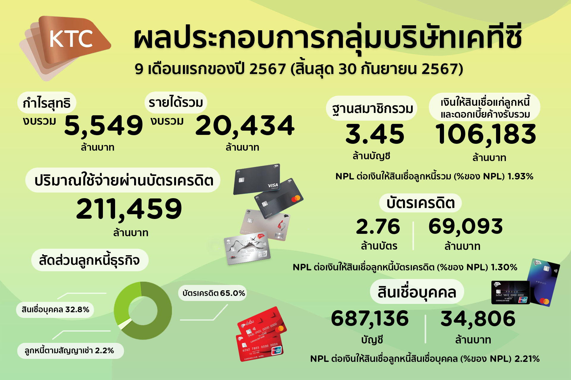 ผลการดำเนินงานของเคทีซีและกลุ่มบริษัทเทียบจากงวดเดียวกันของปี 2566 มีกำไรสุทธิในไตรมาส 3 ปี 2567 เท่ากับ 1,919 ล้านบาท (เพิ่มขึ้น 3.4%) รายได้รวมเท่ากับ 6,890 ล้านบาท เติบโต 6.6% จากรายได้ค่าธรรมเนียมและบริการ และหนี้สูญได้รับคืนที่เพิ่มขึ้นจากการตัดหนี้สูญได้เร็วขึ้น