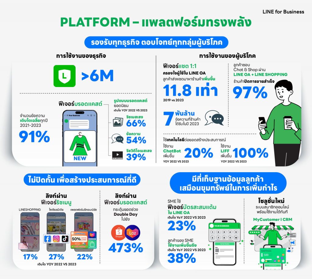 LINE เป็นหนึ่งในแพลตฟอร์มหลักที่ SME ไทยนิยมใช้ทำธุรกิจ ถือเป็นแพลตฟอร์มหนึ่งเดียว ที่สะท้อนถึงรูปแบบพฤติกรรมการซื้อขายผ่านแชตที่คนไทยคุ้นเคยและชื่นชอบจนเป็นเอกลักษณ์ โดย LINE ได้มีการพัฒนาฟีเจอร์ เครื่องมือต่างๆ มาอย่างหลากหลาย ภายใต้ LINE Commerce Solution ช่วยให้ SME ไทยสามารถสร้างธุรกิจบน LINE ได้อย่างครบวงจร