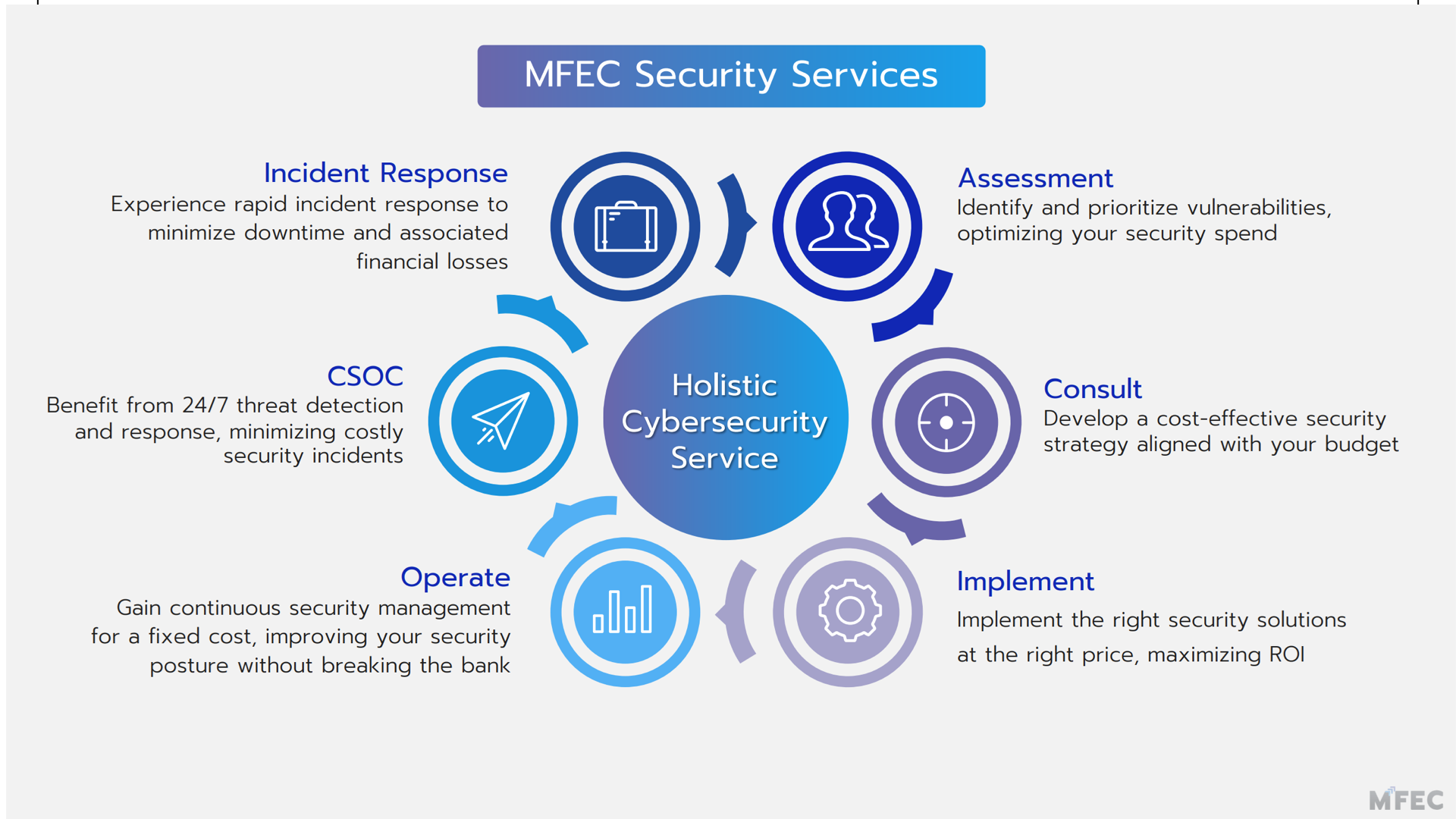 ดำรงศักดิ์ รีตานนท์ ประธานเจ้าหน้าที่บริหารฝ่ายความมั่นคงปลอดภัยไซเบอร์ บริษัท เอ็ม เอฟ อี ซี จำกัด (มหาชน) กล่าวว่า “ในปีนี้ได้วางแนวคิดแบบ องค์รวมหรือบริการครบวงจร สำหรับการบริการในธุรกิจไซเบอร์ซีเคียวริตี้ของ MFEC ที่ประกอบไปด้วย 6 บริการด้วยกันคือ”