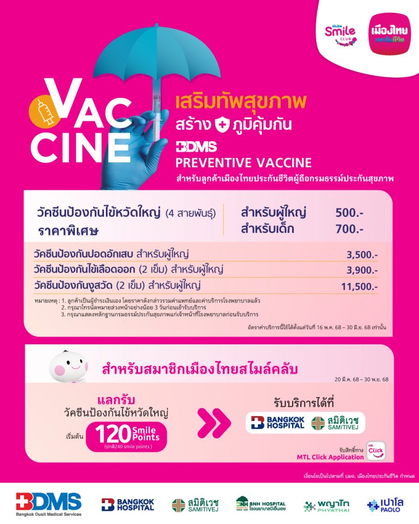 สำหรับผู้ใหญ่ ราคา 3,500 บาท วัคซีนป้องกันโรคไข้เลือดออกสำหรับผู้ใหญ่ (2 เข็ม) รวมราคา 3,900 บาท และวัคซีนป้องกันโรคงูสวัดสำหรับผู้ใหญ่ (2 เข็ม) รวมราคา 11,500 บาท โดยผู้ถือกรมธรรม์ประกันสุขภาพของเมืองไทยประกันชีวิต สามารถแสดงหลักฐานเพื่อเข้ารับบริการได้ ณ โรงพยาบาลในเครือ BDMS ทั่วประเทศ ตั้งแต่วันที่ 16 พฤษภาคม 2568 – 30 มิถุนายน 2568 โดยผู้ที่สนใจสามารถสอบถามรายละเอียดเพิ่มเติม ได้ที่โรงพยาบาลในเครือ BDMS ทั่วประเทศ