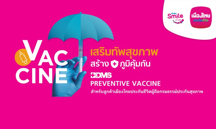 นอกจากนี้ เมืองไทยประกันชีวิตยังได้ร่วมแคมเปญ “BDMS PREVENTIVE VACCINE” มอบสิทธิพิเศษสำหรับผู้ถือกรมธรรม์ประกันสุขภาพ รับวัคซีนในราคาสุดพิเศษ (รวมค่าแพทย์) ครอบคลุม 4 กลุ่มโรคหลัก ได้แก่ วัคซีนป้องกันโรคไข้หวัดใหญ่ 4 สายพันธุ์ สำหรับผู้ใหญ่ราคา 500 บาท และเด็ก ราคา 700 บาท วัคซีนป้องกันโรคปอดอักเสบ