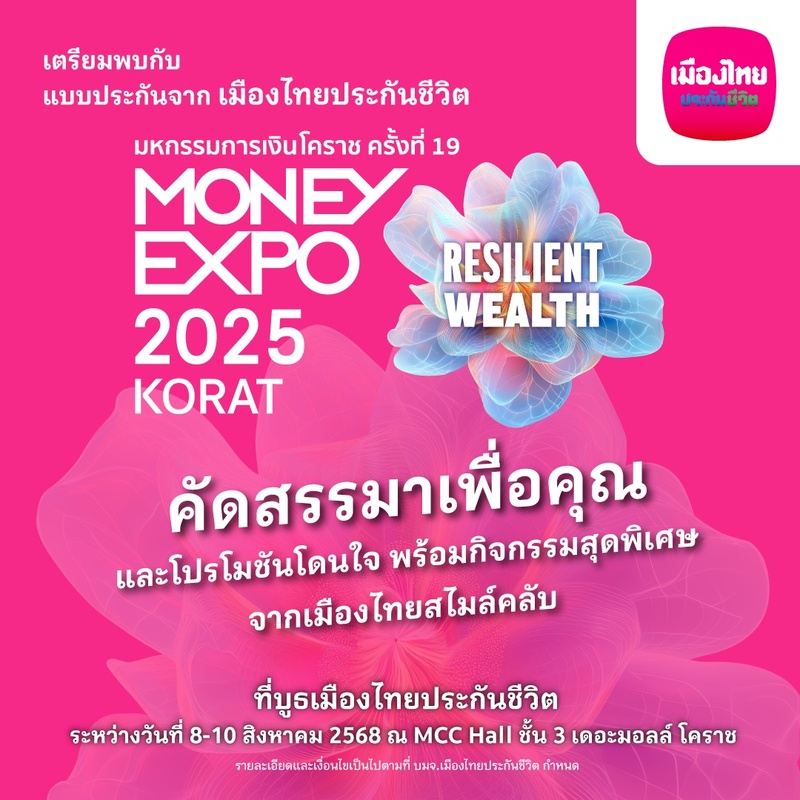 แล้วพบกันที่ บูธเมืองไทยประกันชีวิต ในงานมหกรรมการเงินโคราช ครั้งที่ 19 “Money Expo 2025 Korat” ระหว่างวันที่ 8-10 สิงหาคม 2568 ณ MCC Hall ชั้น 3 เดอะมอลล์ โคราช