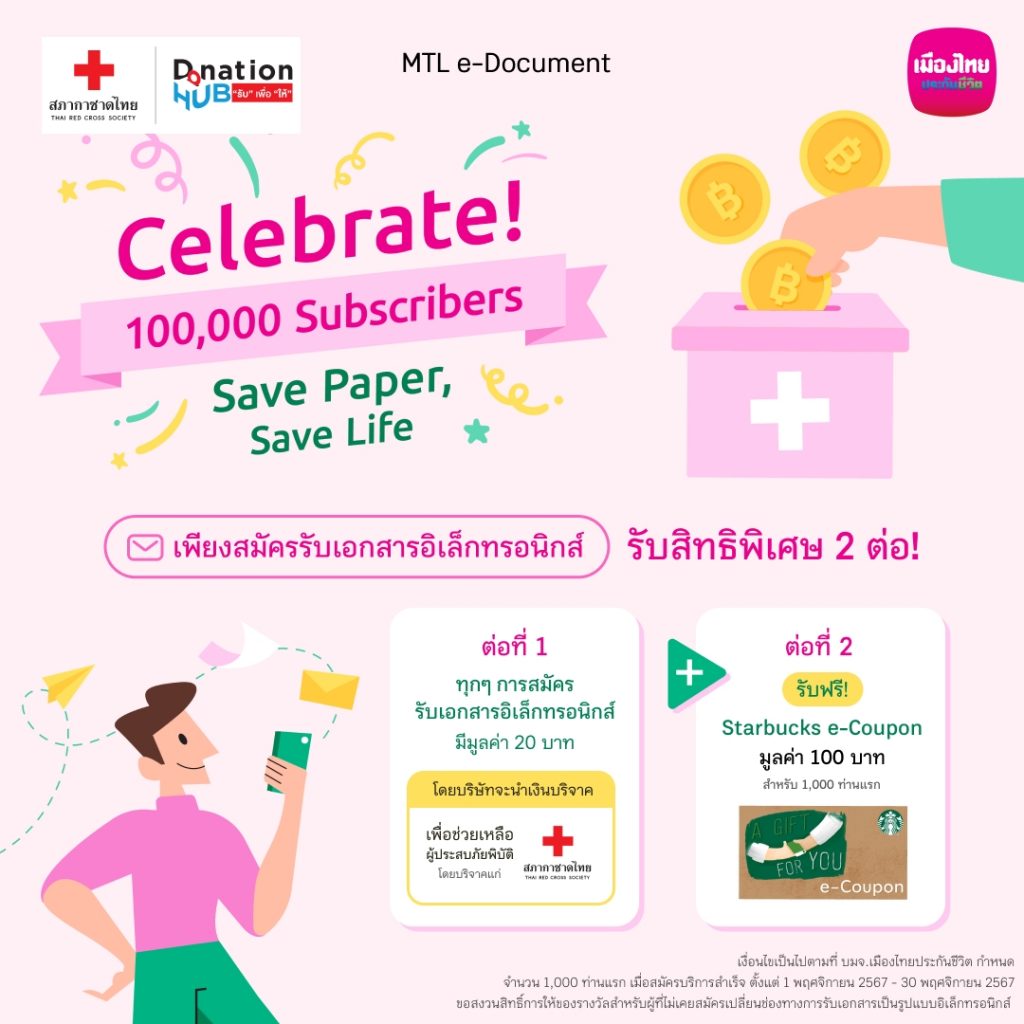 พร้อมเปิดตัวแคมเปญ “Save Paper Save Life” เชิญชวนลูกค้าทุกท่านร่วมเป็นส่วนหนึ่ง ในการรักษ์โลกด้วยการสมัคร MTL e-Document และทุกการสมัครยังจะถูกเปลี่ยนเป็นเงินบริจาคจำนวน 20 บาทต่อ 1 กรมธรรม์ที่สมัครสำเร็จ และนำไปบริจาคให้แก่สภากาชาดไทย เพื่อช่วยเหลือและฟื้นฟูผู้ประสบภัยในพื้นที่ต่างๆ ที่ได้รับความเดือดร้อนอยู่ในขณะนี้อีกด้วย