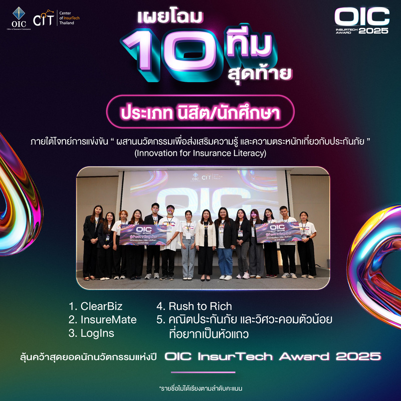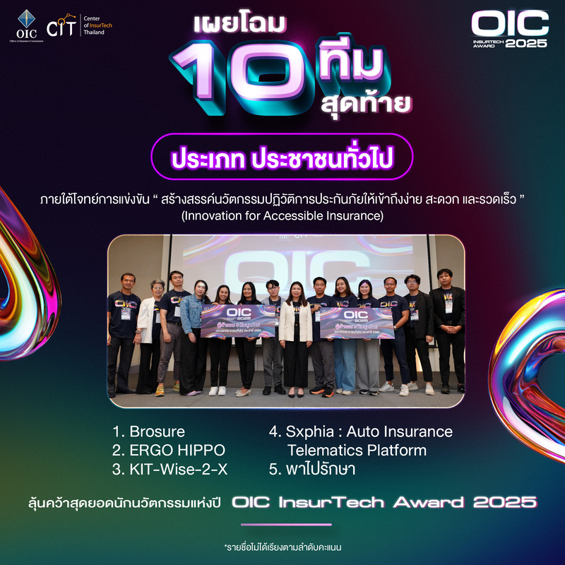 ในโอกาสนี้ สำนักงาน คปภ. ได้คัดเลือกผู้เข้าแข่งขันทั้งหมดจากมากกว่า 400 ทีม ผ่านการคัดเลือกกันอย่างเข้มจากคณะกรรมการผู้ทรงคุณวุฒิ และมีการปรับไอเดียจากคำแนะนำของที่ปรึกษาเฉพาะด้านพร้อมทั้งการนำเสนองานจริงแบบมืออาชีพ จนได้ 10 ทีมสุดท้าย เพื่อเป็นตัวแทนการแข่งขันบนเวทีประดับประเทศ OIC_InsurTech Award 2025 (Finalists)