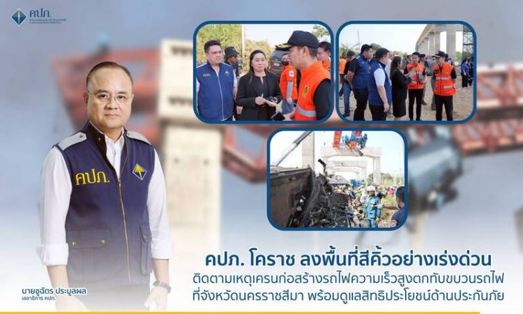 “คปภ. โคราช ลงพื้นที่สีคิ้วอย่างเร่งด่วน ติดตามเหตุเครนก่อสร้างรถไฟความเร็วสูงตกทับขบวนรถไฟ ที่จังหวัดนครราชสีมา พร้อมดูแลสิทธิประโยชน์ด้านประกันภัย