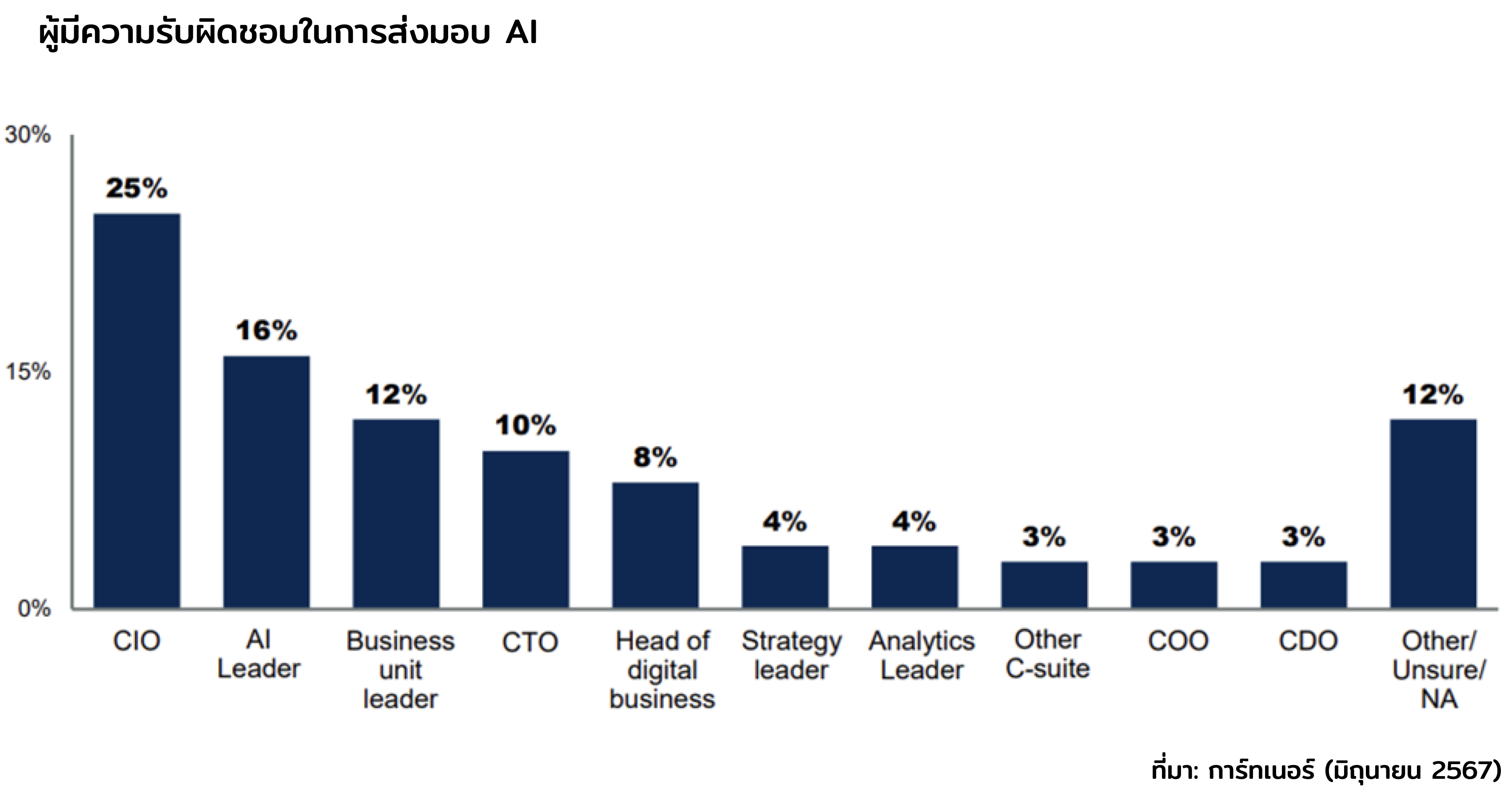 ความรับผิดชอบต่อ AI นั้นกระจายออกไป พนักงานจากหลายแผนกมักมีส่วนร่วมในการริเริ่มโครงการด้าน AI ขณะที่บางองค์กรดำเนินงานแบบกระจายอำนาจ บางแห่งทำงานแยกส่วนกัน หรือบางองค์กรยังไม่ชัดเจนว่าจะนำ AI ไปใช้ในแง่ใด