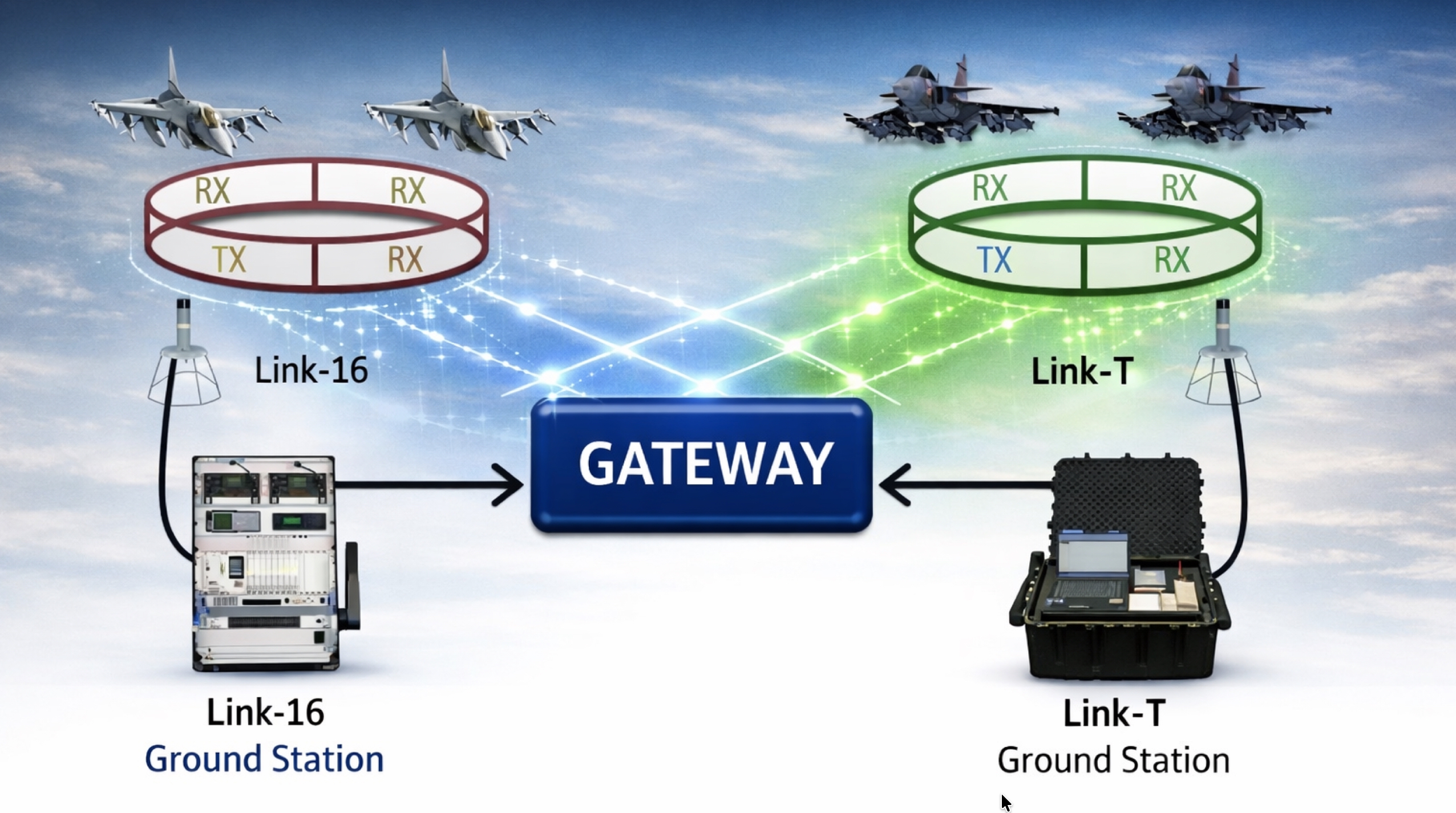 ที่ใช้ระบบเชื่อมโยงข้อมูลทางยุทธวิธี (TDL) ที่ต่างกัน ให้สามารถแลกเปลี่ยนข้อมูลกันได้ โดยผ่านอุปกรณ์ที่เรียกว่า Interoperability Gateway ซึ่งถือเป็นเทคโนโลยีที่ทันสมัย ได้มานำเสนอการพัฒนา Gateway ให้กับกองทัพอากาศไทย สำหรับ LINK-T บน Gripen และ LINK-16 บน F-16 ให้สามารถใช้งานและแลกเปลี่ยนข้อมูลร่วมกันได้