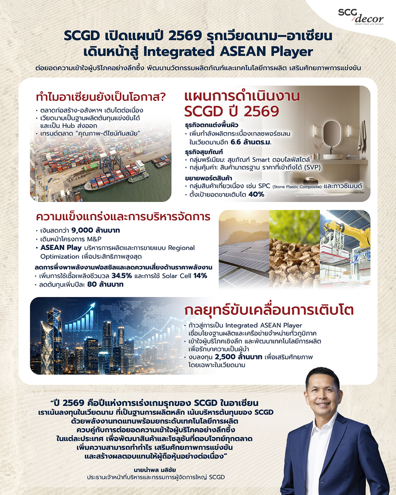 บริษัท เอสซีจี เดคคอร์ จำกัด (มหาชน) หรือ SCGD เผยจากการประเมินแนวโน้มธุรกิจก่อสร้างและอสังหาริมทรัพย์ในภูมิภาคอาเซียนที่ยังมีศักยภาพเติบโตได้อย่างต่อเนื่อง ประกอบกับความสามารถในการบริหารต้นทุนการผลิตที่แข่งขันได้ แม้ภาวะเศรษฐกิจโลกยังมีความไม่แน่นอน จึงประกาศเปิดแผนธุรกิจประจำปี 2569 เดินหน้าสู่การเป็น Integrated ASEAN Player อย่างเต็มรูปแบบ