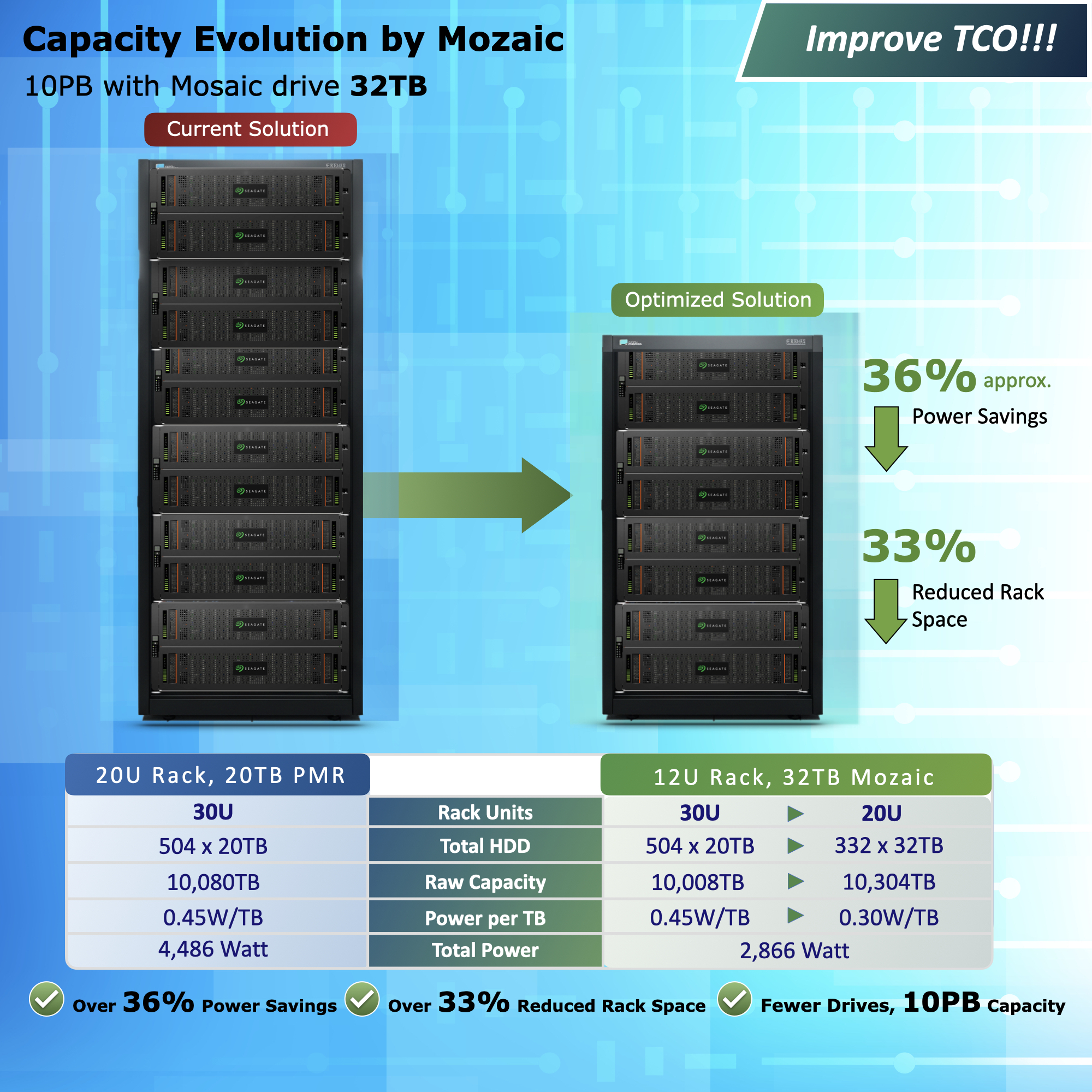การเปลี่ยนจาก 20TB PMR ไปสู่ 32TB Mozaic ไม่ได้เป็นเพียงการเพิ่มความจุต่อไดรฟ์ แต่เป็นการเพิ่มประสิทธิภาพเชิงโครงสร้างของดาต้าเซ็นเตอร์ ทั้งในด้านพลังงาน พื้นที่ และต้นทุนโดยรวม (TCO)