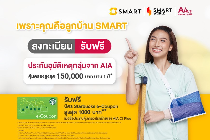 “ล่าสุด SMART ร่วมมือกับแอปฯ ALive Powered by AIA มอบสิทธิประโยชน์ในการคุ้มครองลูกบ้านสมาร์ทจากอุบัติเหตุผ่านแอปฯ “SMART WORLD” กับประกันอุบัติเหตุกลุ่ม จาก เอไอเอ วงเงินคุ้มครอง 150,000 บาท ระยะเวลาคุ้มครองนาน 1 ปี นอกจากนี้เรายังมีสิทธิพิเศษเพิ่มเติมไว้ให้สำหรับลูกบ้านที่ซื้อประกันคุ้มครองโรคร้ายแรง AIA CI Plus อีกด้วย”