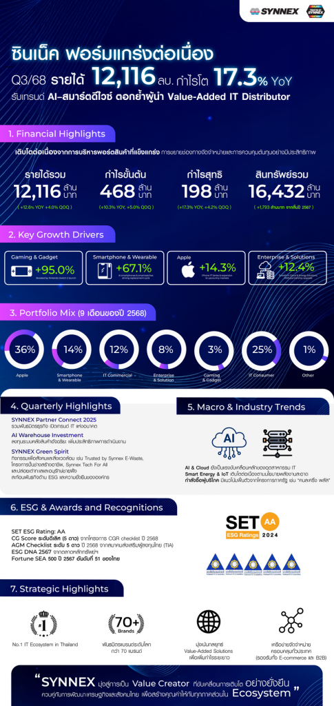 บมจ.ซินเน็ค (ประเทศไทย) หรือ SYNEX โชว์ศักยภาพโตแรง! Q3/68 กำไรพุ่ง 17.3% แตะ 198 ลบ. กวาดรายได้รวม 12,116 ลบ. รับอานิสงส์เทรนด์ AI และ Smart Device ที่ขยายตัวโดดเด่น หนุนกลุ่ม Apple, Smartphone & Wearable โตต่อเนื่อง พร้อมยกระดับความร่วมมือกับ AWS สู่ Advanced Tier Services Partner เสริมพอร์ต Smart Energy Solution และสินค้ามาร์จิ้นสูง ตอกย้ำกลยุทธ์ Value-Added IT Distributor ที่มุ่งสร้างคุณค่าให้กับลูกค้าและพันธมิตรทางธุรกิจ เพื่อการเติบโตอย่างยั่งยืน