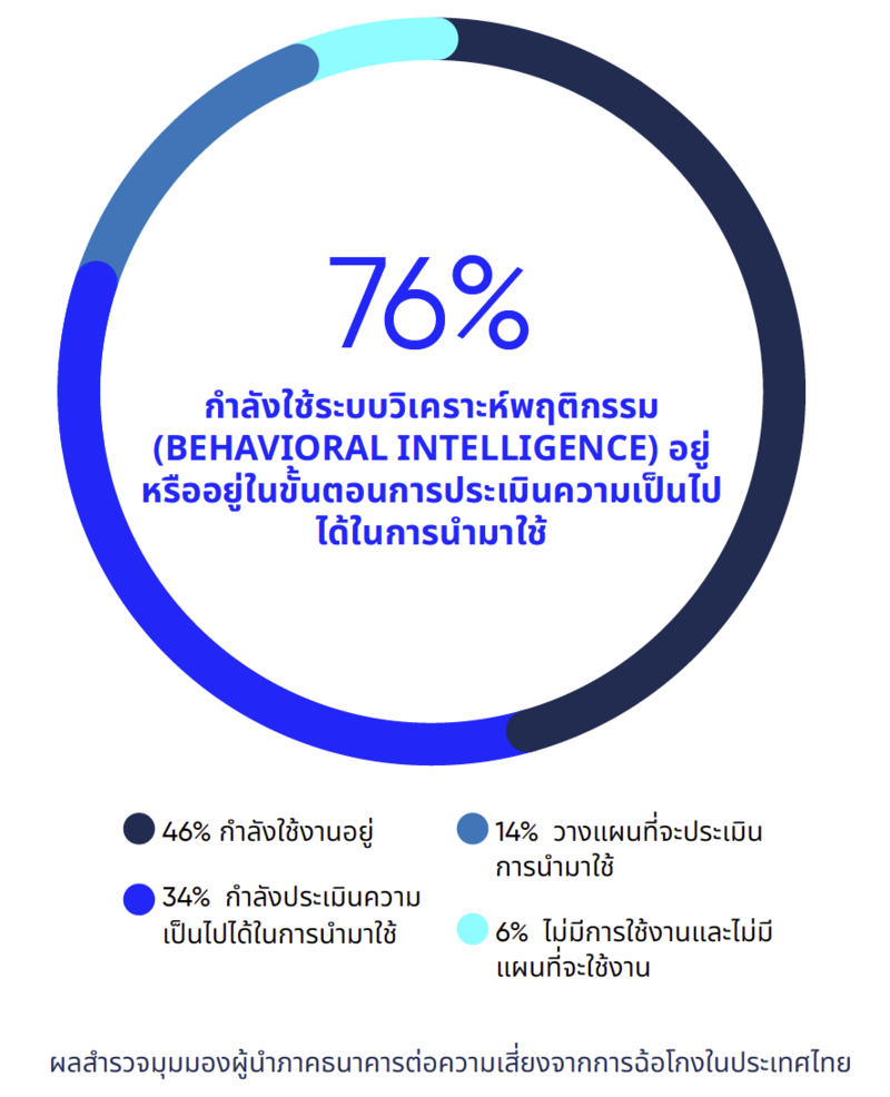 - ให้คุณค่ากับการวิเคราะห์ด้านพฤติกรรม: ผู้นำในภาคธนาคารไทยมองว่าโซลูชันที่อาศัยการวิเคราะห์พฤติกรรมมีคุณค่าสูง โดย 76% ระบุว่าธนาคารของตนใช้งานโซลูชันแบบดังกล่าวอยู่แล้ว หรืออยู่ระหว่างประเมินเพื่อพิจารณานำมาใช้